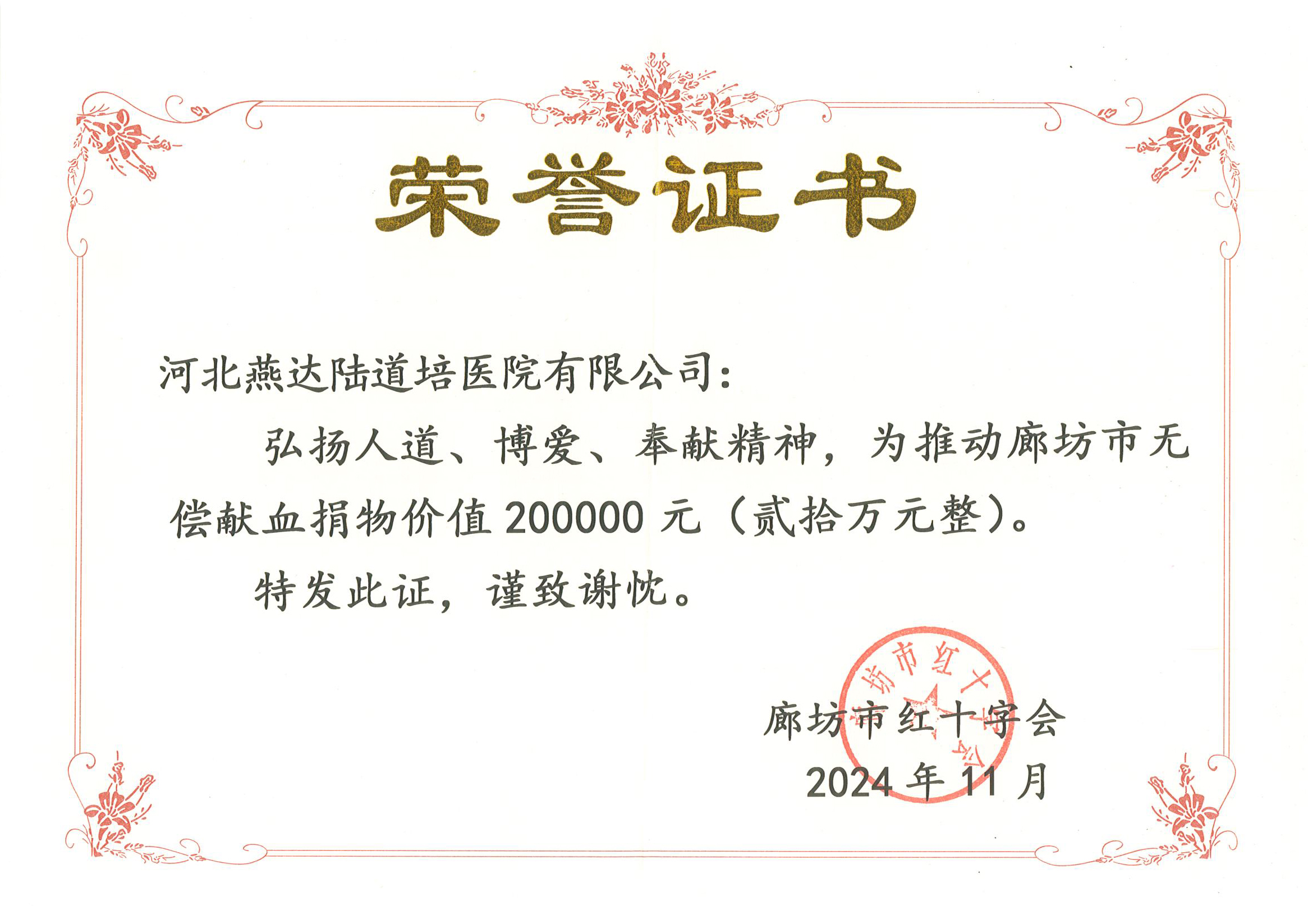 弘揚人道、博愛、奉獻精神,為推動廊坊市無償獻血捐物價值 200000 元(貳拾萬元整)。