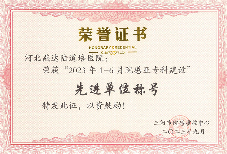 河北燕達(dá)陸道培醫(yī)院榮獲2023年1-6月院感亞專科建設(shè)先進(jìn)單位稱號(hào)